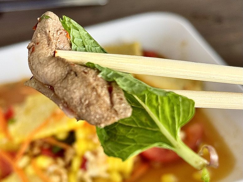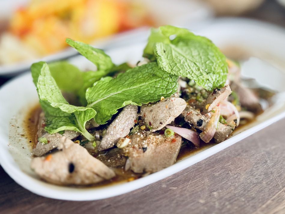 雖然名字叫「หวาน(甜)」,但其實 ตับหวาน 並不是甜的,而是一道香辣微酸的豬肝涼拌。它是泰國東北(Isan)地區的經典下飯菜,也是很多當地人愛吃的內臟料理之一。豬肝經過快速川燙,保持嫩中帶微微的粉紅,不柴不腥,接著用檸檬汁、魚露、辣椒粉、香菜、洋蔥、薄荷葉和烤米粉(ข้าวคั่ว)拌勻,一端上桌香氣四溢!